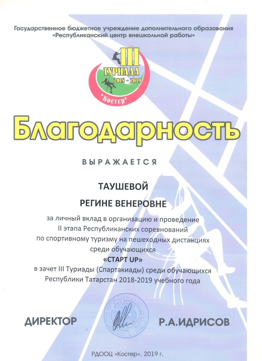 Таушева Р.В. - Благодарственное письмо ГБУ ДО "РЦВР" за личный вклад в организацию и проведение II Республиканских соревнований по спортивному туризму на пешеходных дистанциях "СТАРТ UP" - 2019