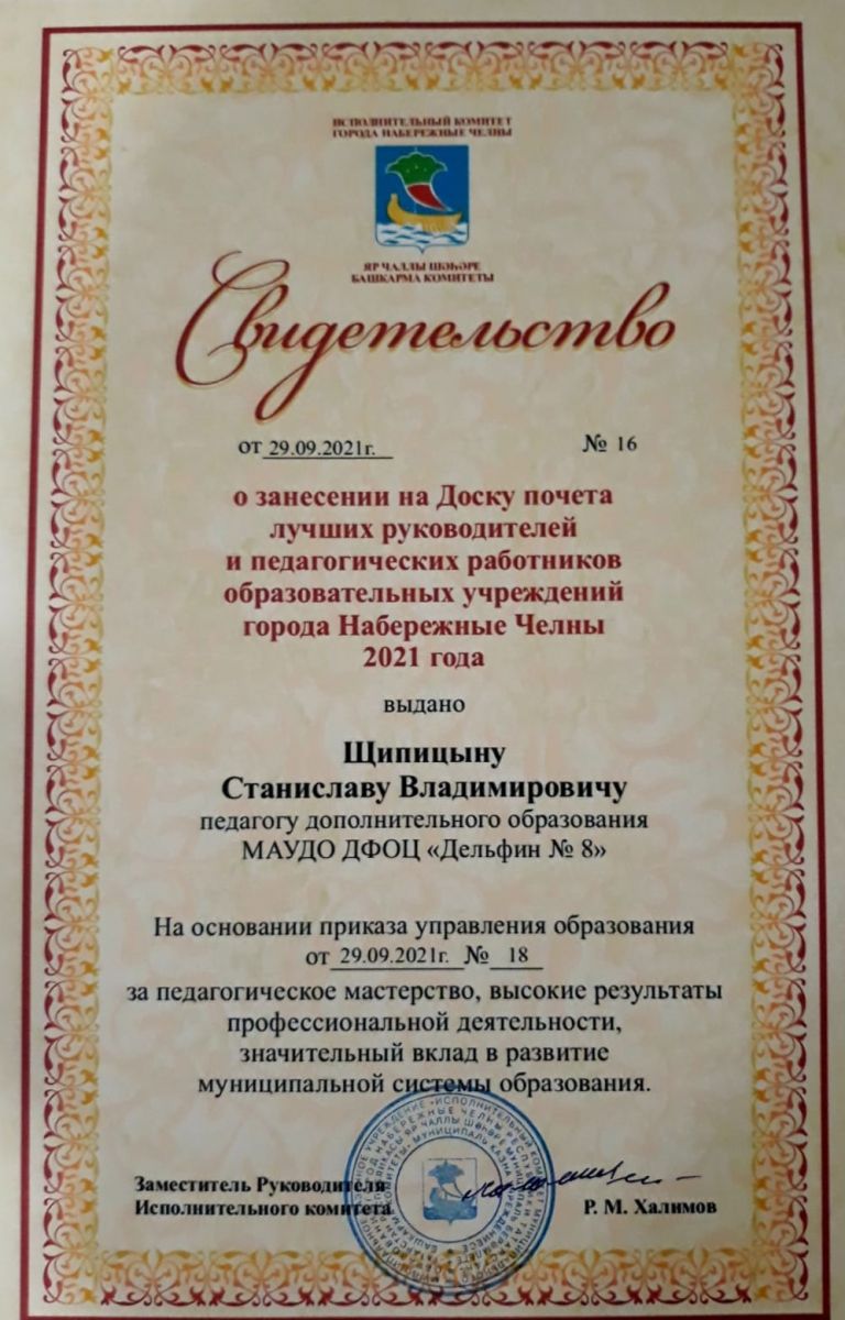 Щипицын С_В_- занесен на Доску почета лучших руководящих и педагогических работников образовательных учреждений города Набережные Челны - 2021