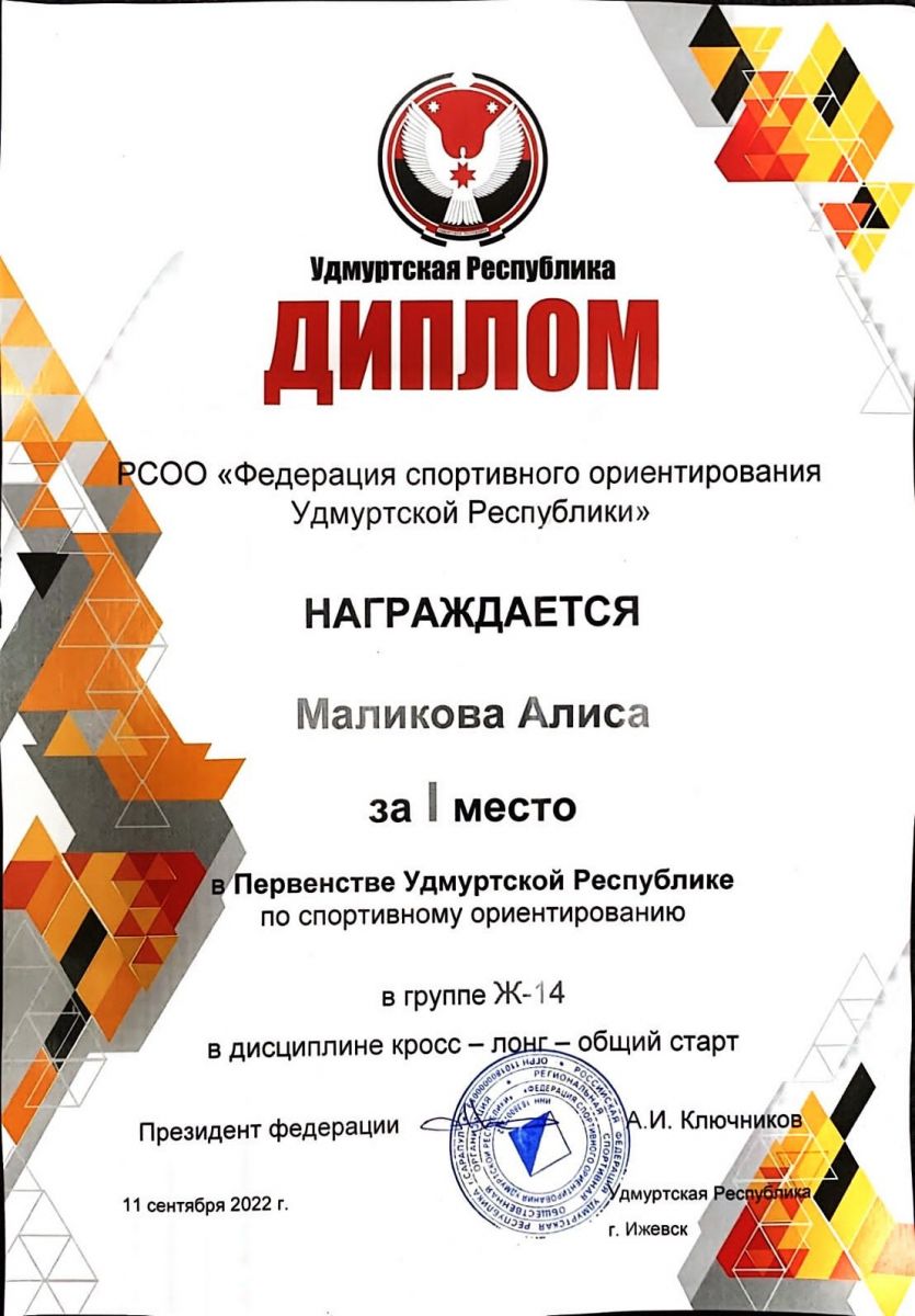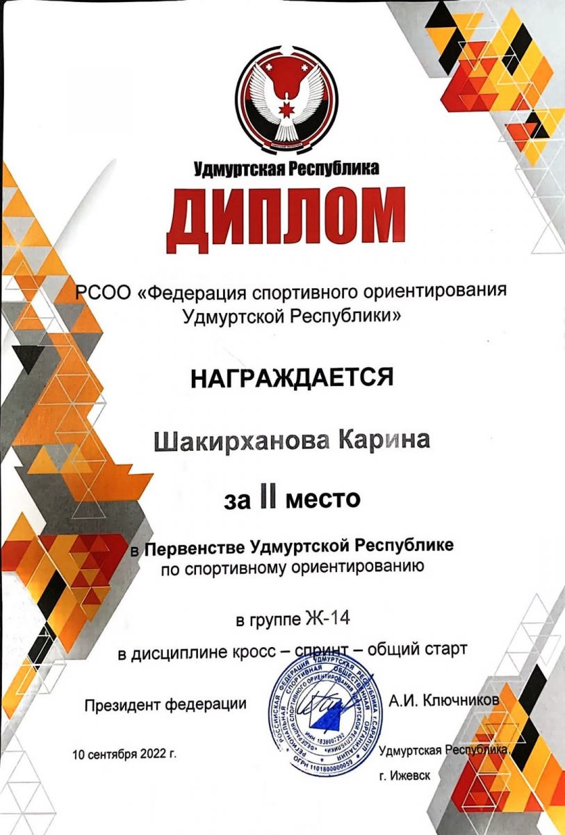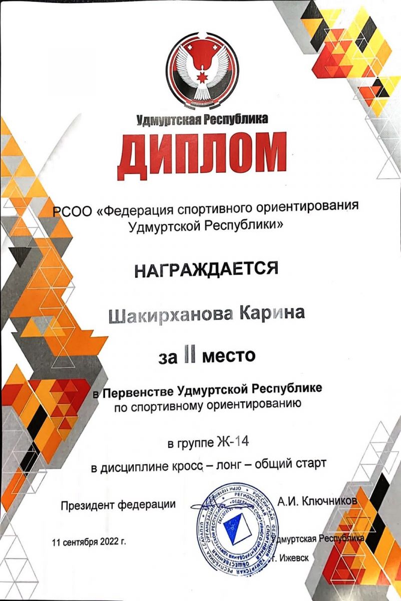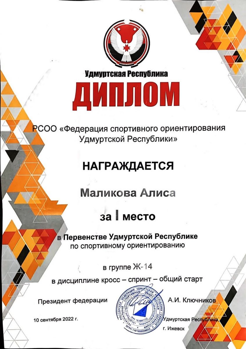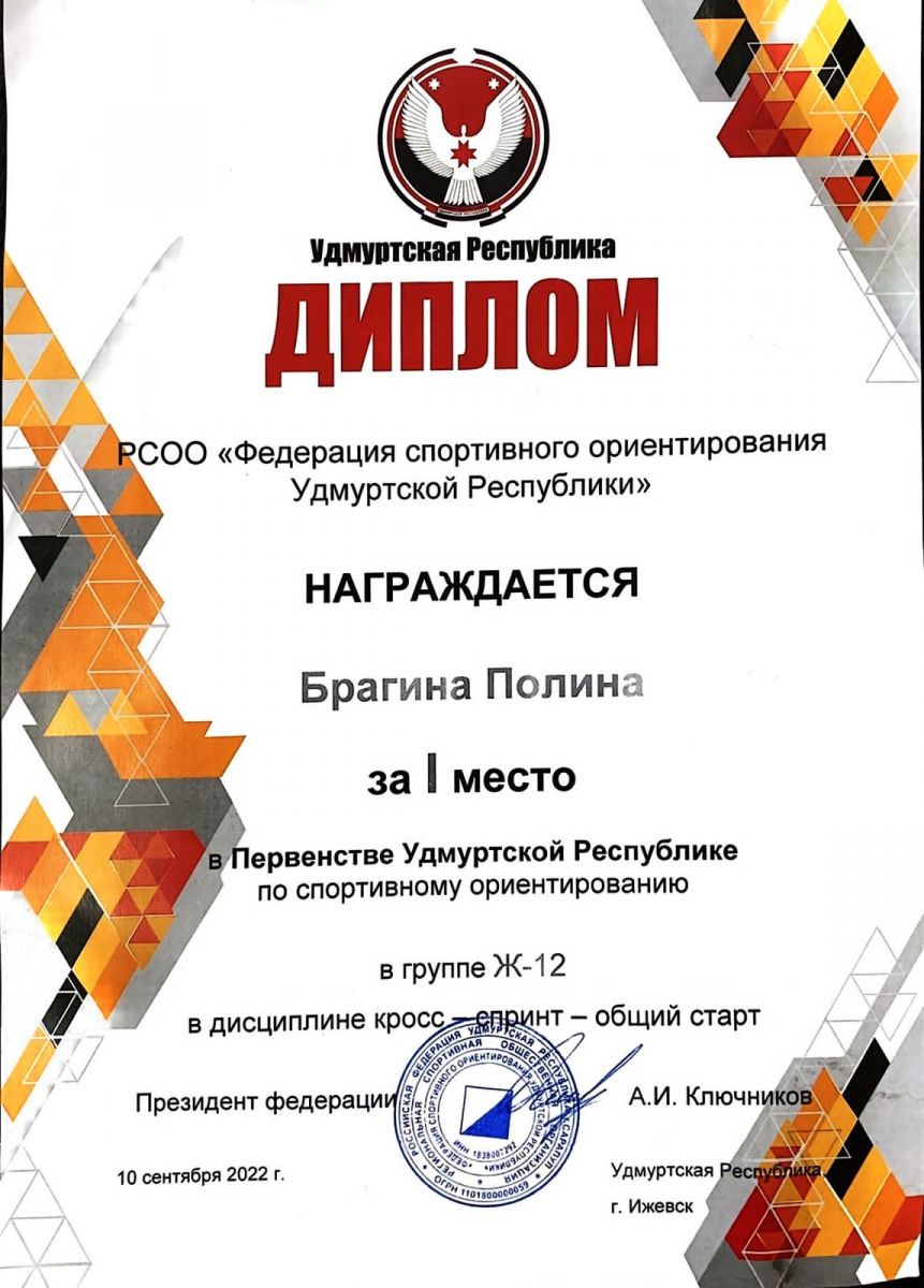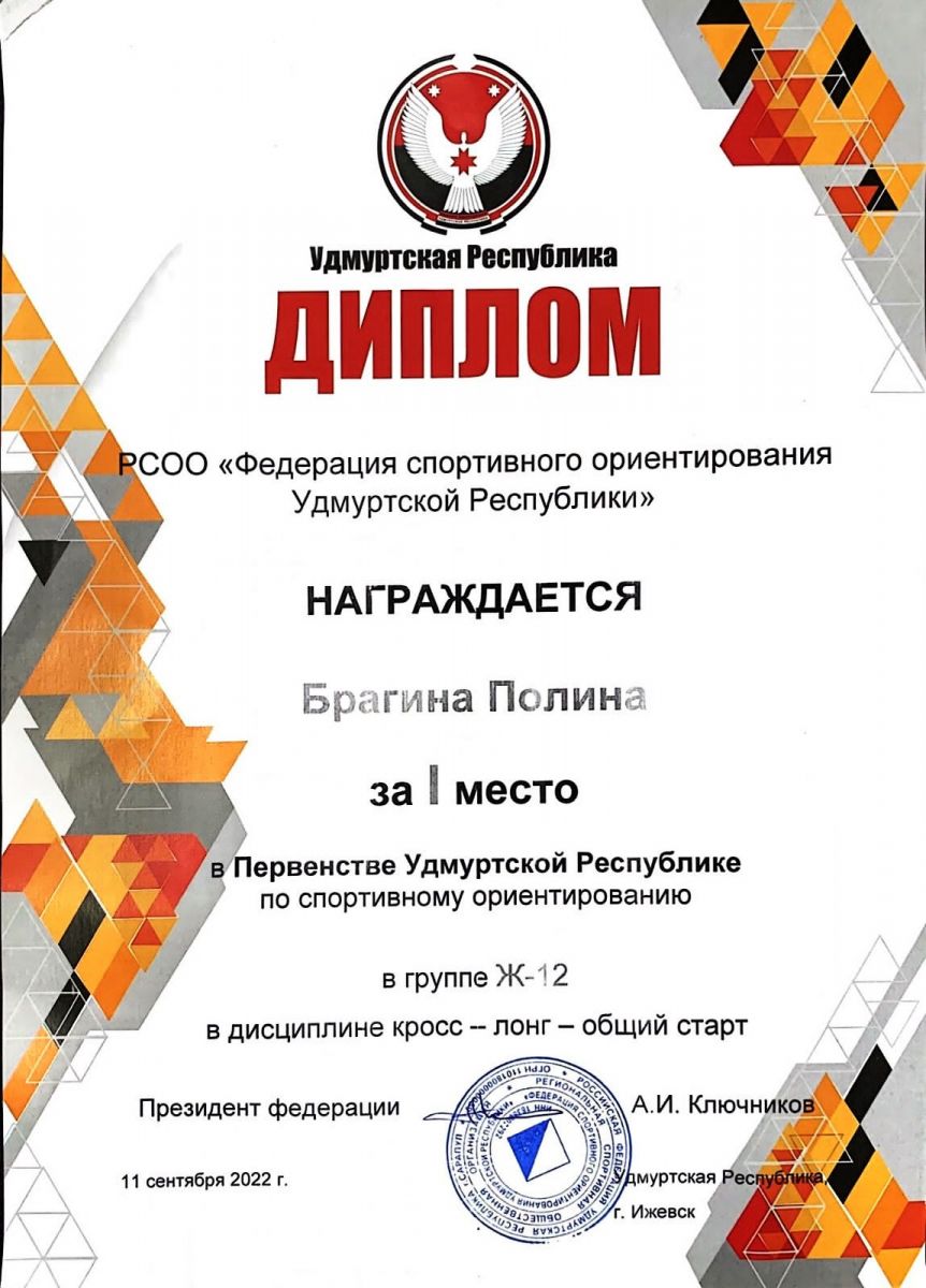 Брагина Полина 1 мест (кросс-спринт-общий старт), Маликова Алиса 1 место (кросс-спринт-общий старт), Брагина Полина 1 место (кросс-лонг-общий старт), Маликова Алиса 1 место (кросс-лонг-общий старт), Шакирханова Карина 2 место (кросс-лонг-общий старт), Шакирханова Карина 2 место (кросс-спринт-общий старт) в Открытом турнире Республики Удмуртия по спортивному ориентированию (10.09.2022)