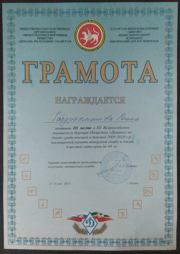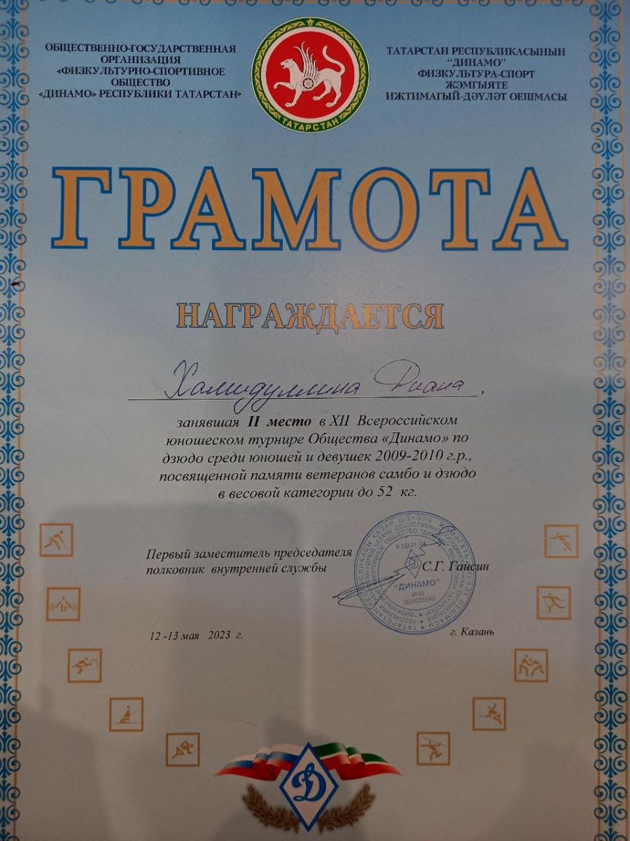 Хамидуллина Диана 2 место, Габдрахманова Регина 3 место в XII Всероссийском юношеском турнире Общества "Динамо" по дзюдо среди юношей и девушек 2009-2010 г.р. (12-13.05.2023)