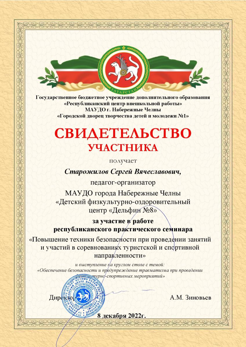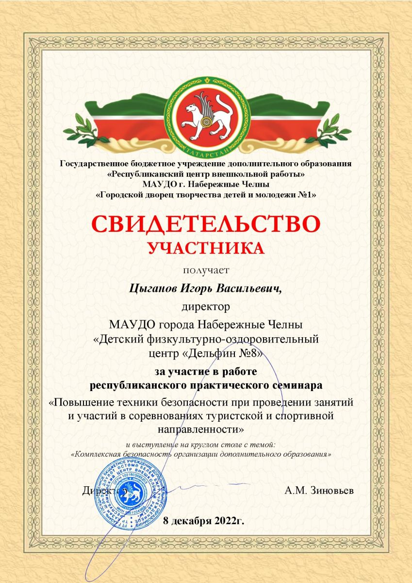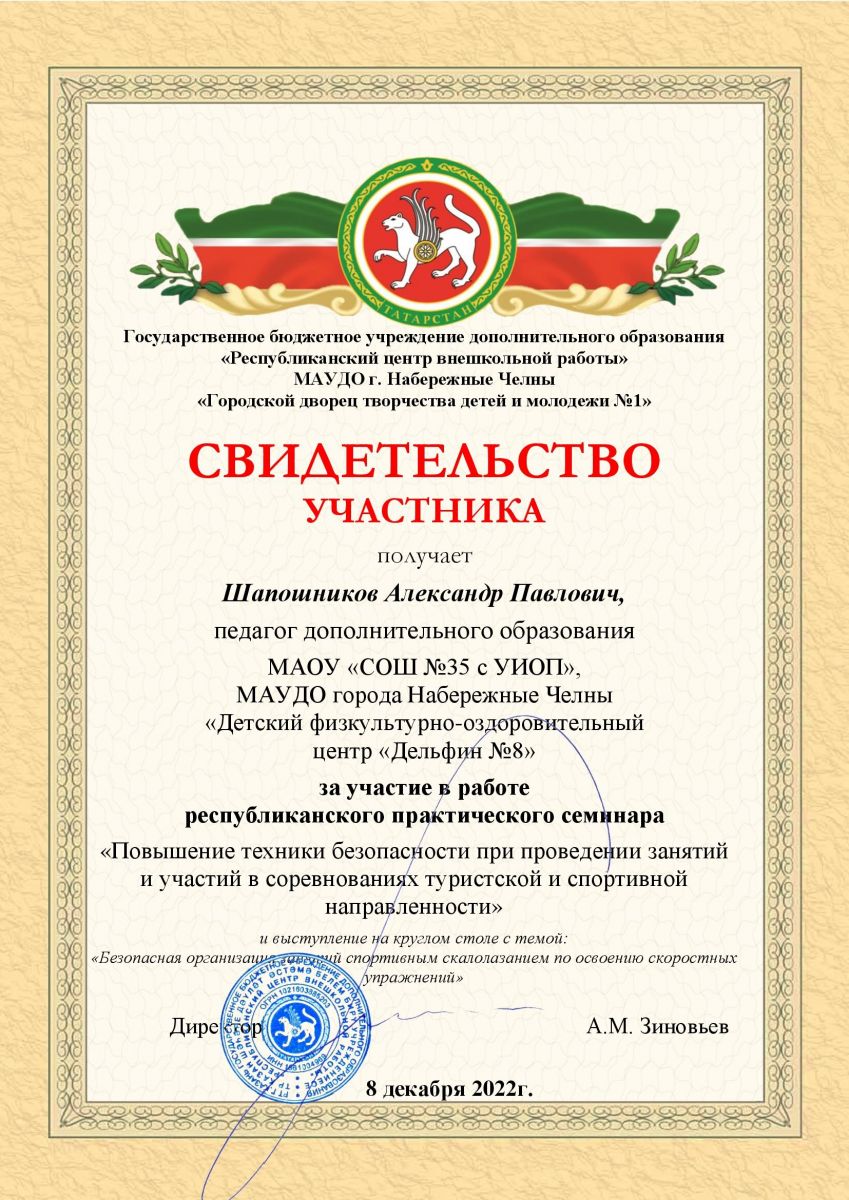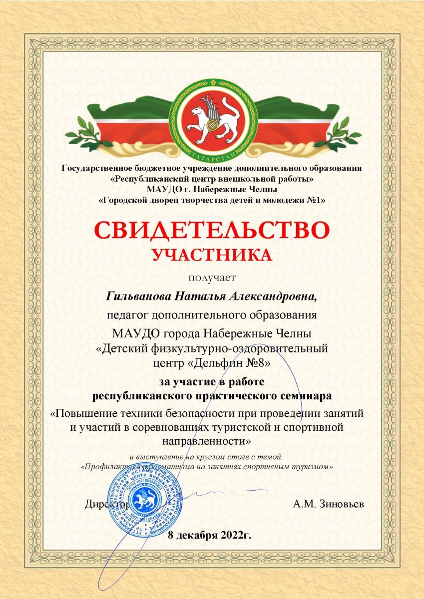 Арзамасцева Р.В., Борознова Г. А., Бурганова О. В. Валинуров Р. Р., Гильванова Н. А., Дубовая М. М., Зиаева Л. М., Зиятдинов Р. Г., Ильина Г. Ф., Миниханова С. А., Михейкина Н. Р., Таушев С_С., Старожилов С. В., Цыганов И. В., Шапошников А. П., Щипицын В. В., Юсупов Р. Р. - приняли участие в Республиканском практическом семинаре "Повышение техники безопасности при проведении занятий и участий в соревнованиях туристской и спортивной направленности" (08.12.2022 г.)