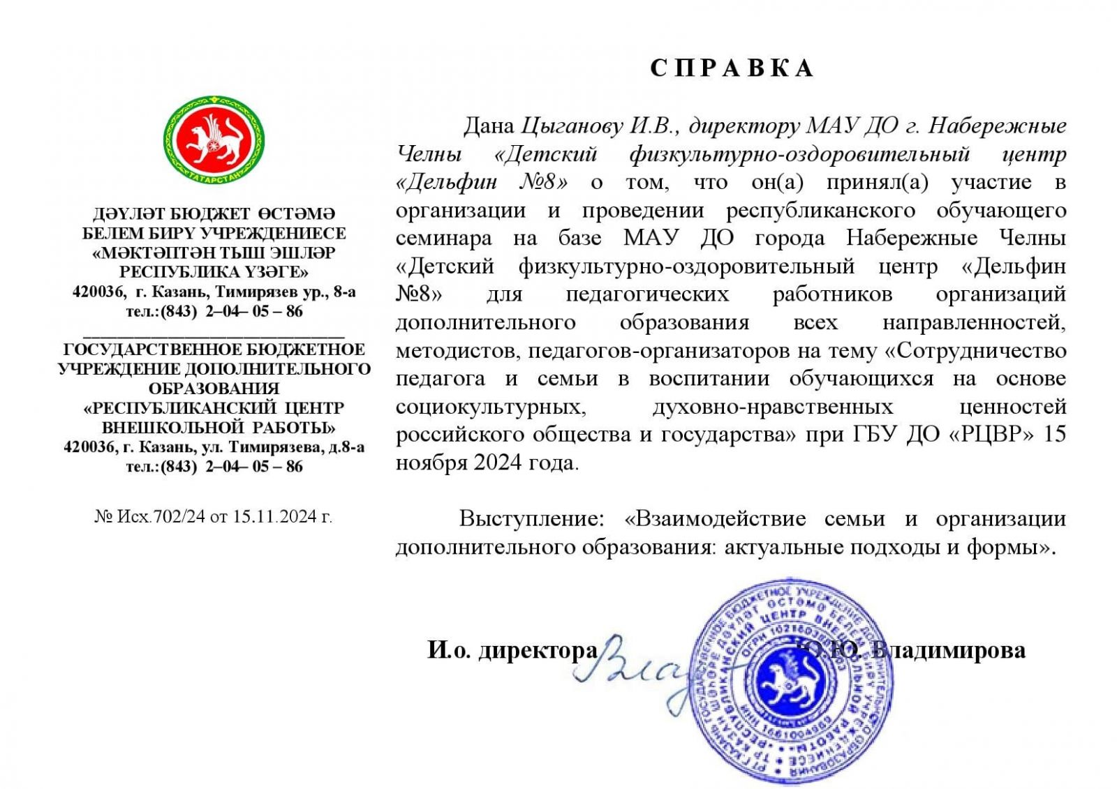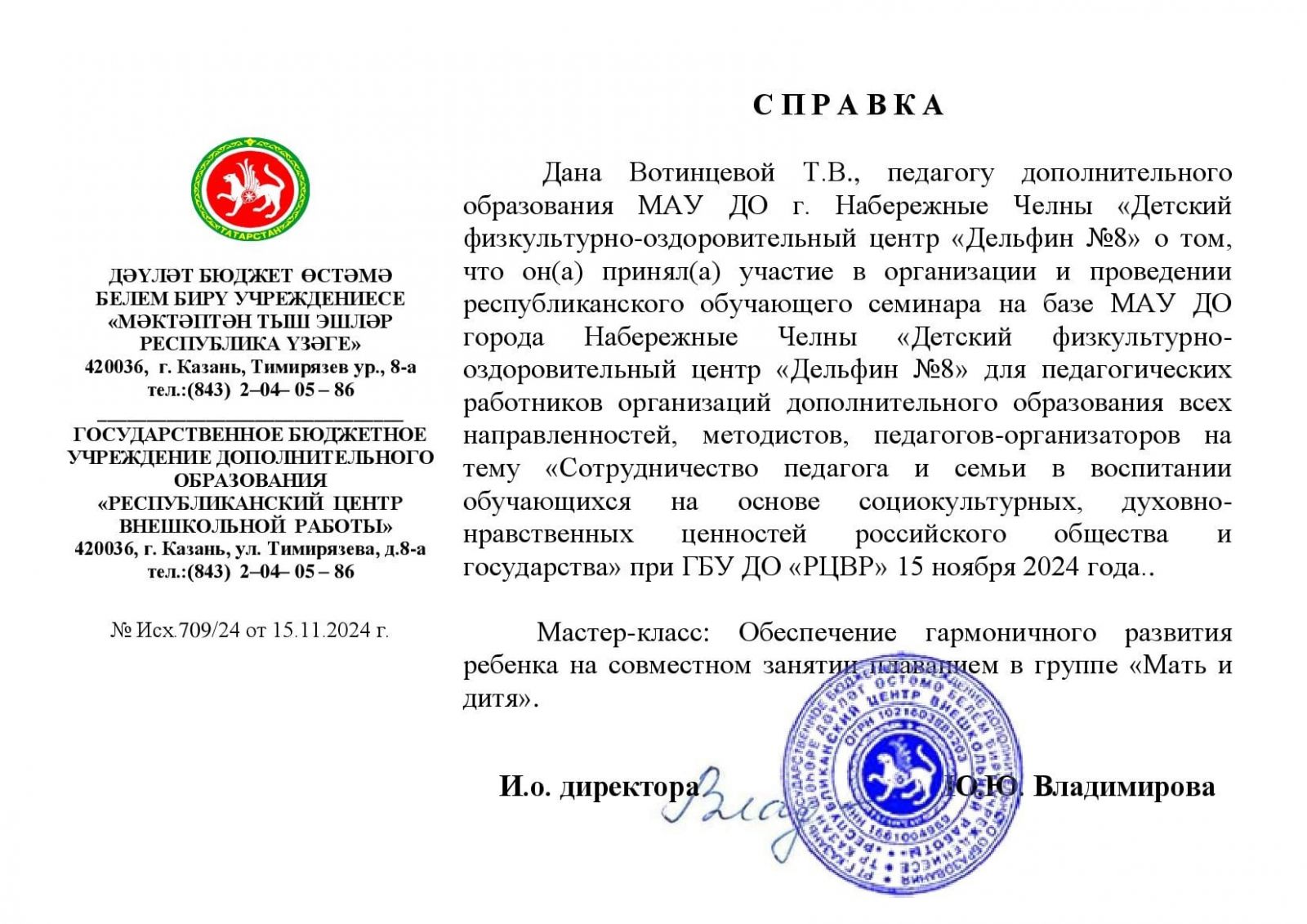 - Вотинцева Т.В., Дубовая М.М., Ильина Г.Ф., Миниханова С.А., Цыганов И.В. - приняли участие в республиканском обучающем семинаре "Сотрудничество педагога и семьи в воспитании обучающихся на основе социокультурных, духовно-нравственных ценностей российского общества и государства" (15.11.2024)