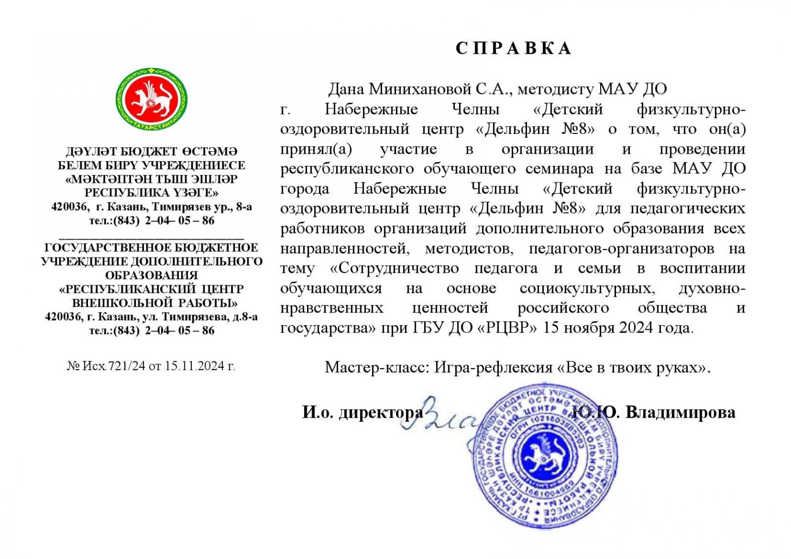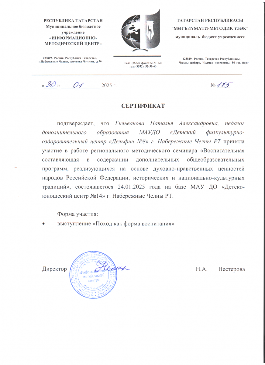 - Гильванова Н.А., Сабирова Л.М., Ильина ГФ. Акмалова А.А.- приняли участие в региональном методическом семинаре: "Воспитательная состовляющая в содержании дополнительных общеобразовательных программ, реализующихся на основе духовно-нравственных ценностей народов Российской Федерации, исторических и национально-культурных традиций" (24.01.2025)