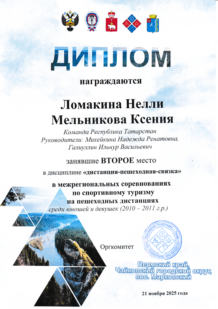 - Тихонова Вера 3 место, Команда девочки 8-13 лет 3 место, Сборная команда РТ 8-13 лет 2 место в Межрегиональных соревнованиях по спортивному туризму на пешеходных дистанциях среди мальчиков и девочек 8-13 лет (31.10.2025)