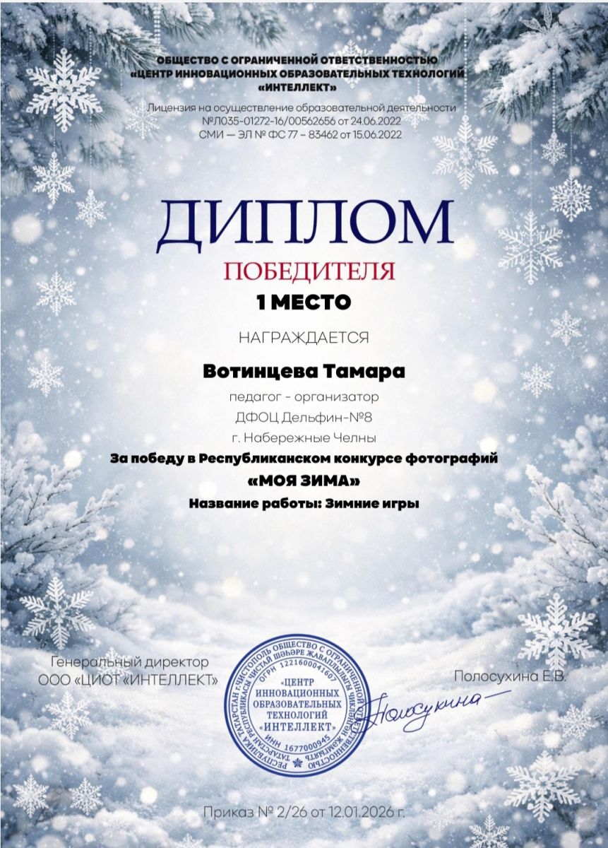 • Вотинцева Т.В. - 1 место в Республиканском конкурсе фотографий "Моя зима" (Приказ №2/26 от 12.01.2026 г.)
