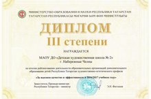 По итогам рейтингования деятельности образовательных организаций дополнительного образования детей Республики Татарстан художественно-эстетического профиля в номинации "За высокое качество и эффективность в 2016/2017 учебном году" Детская художественная школа №2" г. Набережные Челны отмечена дипломом III степени. Поздравляеи и благодарим наших воспитанников , родителей и коллектив за слаженную и результативную работу.