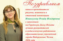 Имангулова Резида Ильдаровна, преподаватель рисунка, живописи и станковой композиции Детской художественной школы №2 занесена на Доску Почета лучших руководителей и педагогических работников образовательных учреждений города Набережные Челны 2016. -