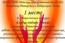 Преподаватели художественной школы, участвовавшие во Всероссийском конкурсе методических разработок и программ «Сердце отдаем детям» в номинациях: Педагогика полноценных каникул, Методическая копилка, заняли первые места. Поздравляем Белкину М.В., Запорожан О.В., Ахметшину Г.М., Алексееву В.В., Иванову М.Б. и желаем вдохновения на пути к новым профессиональным достижениям! 19.05.2015