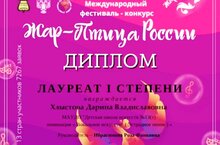 Поздравляем учащихся вокального отделения: Ибрагимова Ильфата (лауреат1), Хлыстову Дарину (лауреат 1), Фиткулову Ясмину (лауреат 1), Мухаммадиева Тагира (лауреат 1), Вахитову Алию (лауреат 1), вокальный ансамбль «Голчэчэк» (лауреат 1), Вахитова Камиля (лауреат 2) с успешным выступлением на международном фестивале-конкурсе «Жар - Птица России». Желаем дальнейших творческих побед !