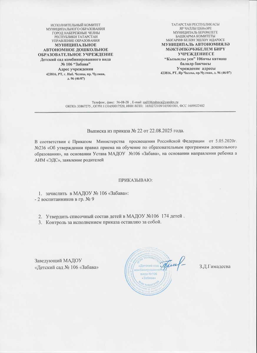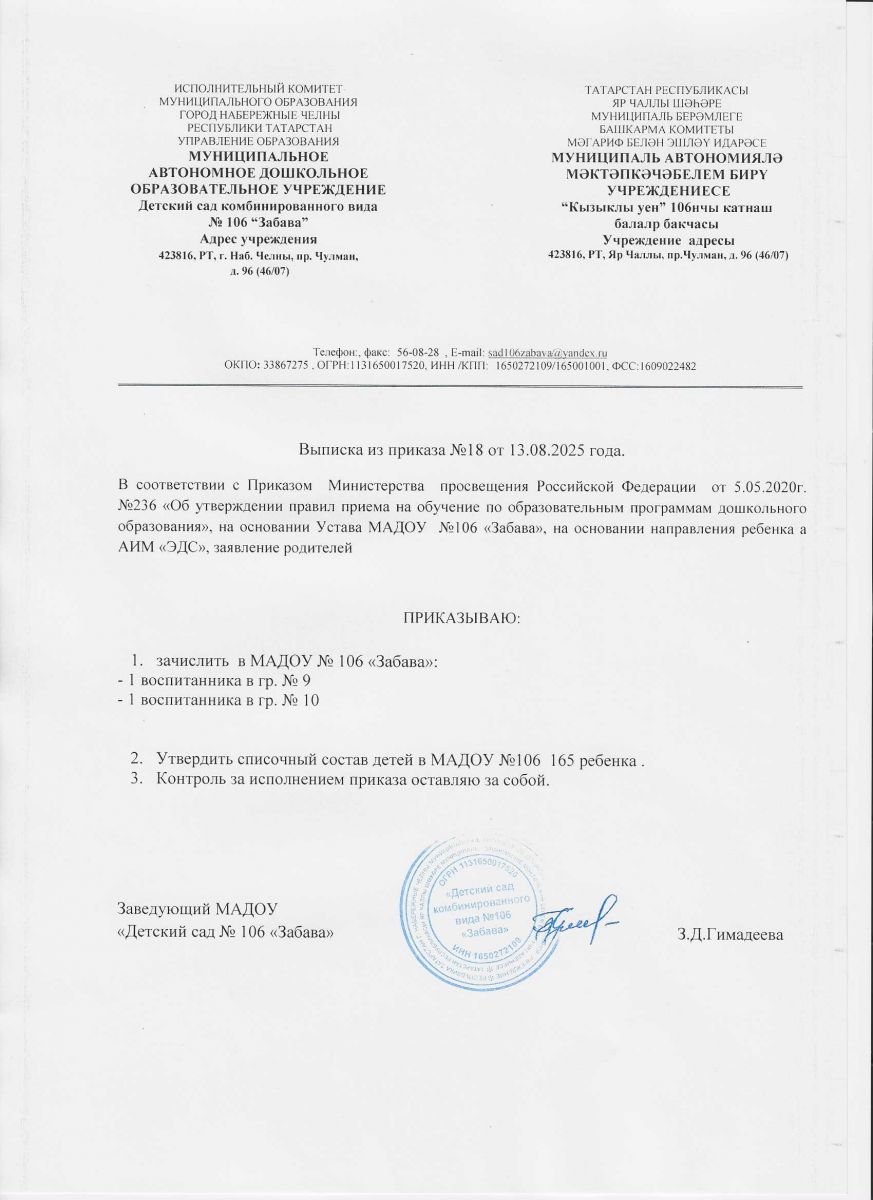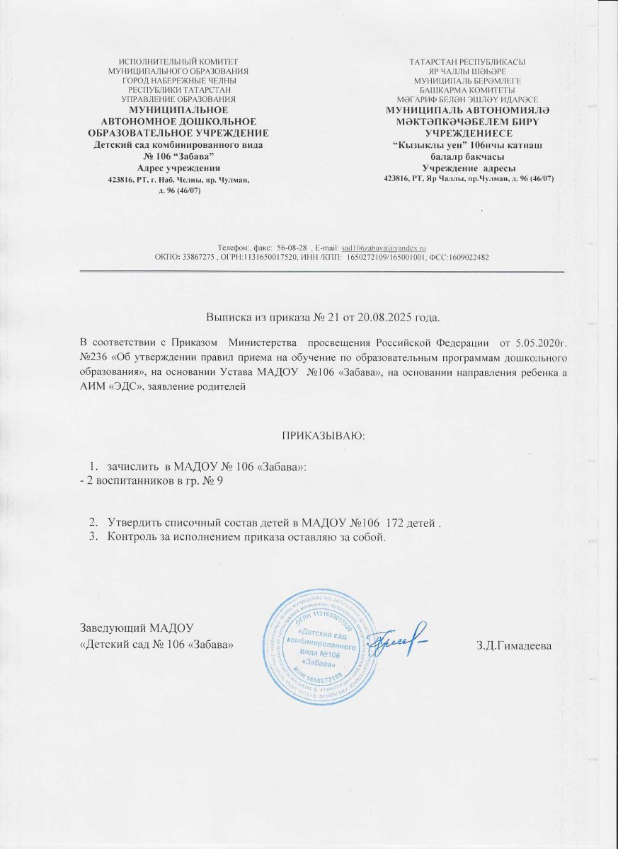 Муниципальное автономное дошкольное образовательное учреждение города Набережные Челны «Детский сад комбинированного вида № 106 «Забава» Яр Чаллы шәһәренең «106 нчы «Кызыклы уен» катнаш төрдәге балалар бакчасы» муниципаль автономияле мәктәпкәчә белем бирү учреждениесе"