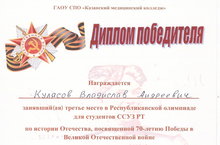 Триумф на республиканской олимпиаде по истории Отечества 22.05.2015 21 мая 2015 года в Казанском медицинском колледже прошла олимпиада по истории Отечества, посвященная 70-летию Победы в Великой Отечественной войне для студентов СССУЗ РТ. 54 участника со всей республики выявляли сильнейшего знатока истории Великой Отечественной войны.