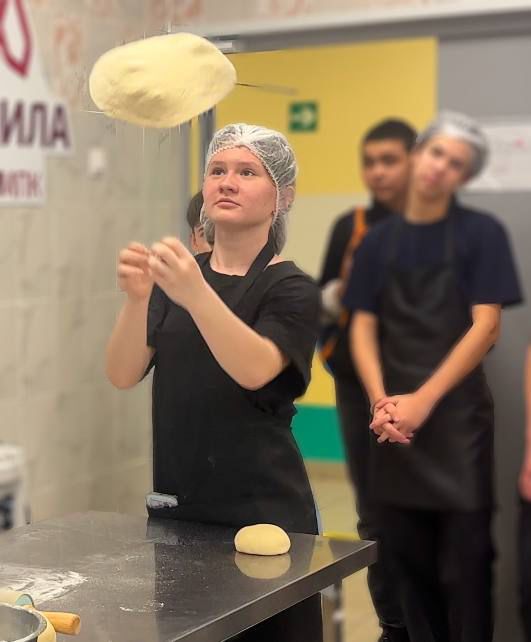 Мероприятие открыл Мастер-класс от PROFI – Вадима Прокофьева! (наш выпускник 2024 года, а сейчас – повар в известном ресторане "Фергана»). Вадим поделился секретами мастерства, показав, как раскатывать тесто с помощью захватывающей "спиннинговой" техники (это когда тесто подбрасывается в воздух!). Поверьте, выглядит это очень эффектно!