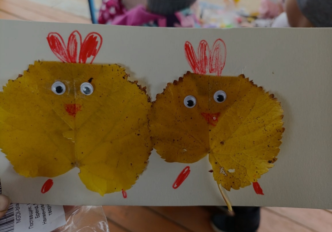 Сегодня на прогулке воспитанники старшей группы № 9, приложив немного усилий, сохранили краски осени надолго, сделав прекрасные аппликации. Для этого им понадобились - лист картона в качестве основы, собранные листья, клей, кисть, фломастер. Сначала придумали будущую картинку из подходящих по форме листьев. Затем скомпоновали на отдельном листе, а потом начать приклеивать отдельные части-листики к основе. Недостающие элементы пририсовали фломастером. Так у ребят получились очень забавные цыплята????