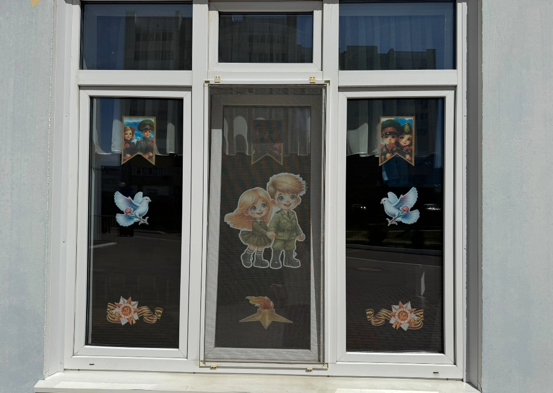 Окна детского сада украшены главными символами победы - Вечным огнем и звездами, Георгиевскими лентами и белыми журавлями. Здесь же можно полюбоваться ярким салютом и летящими белыми голубями - символами мира и добра.