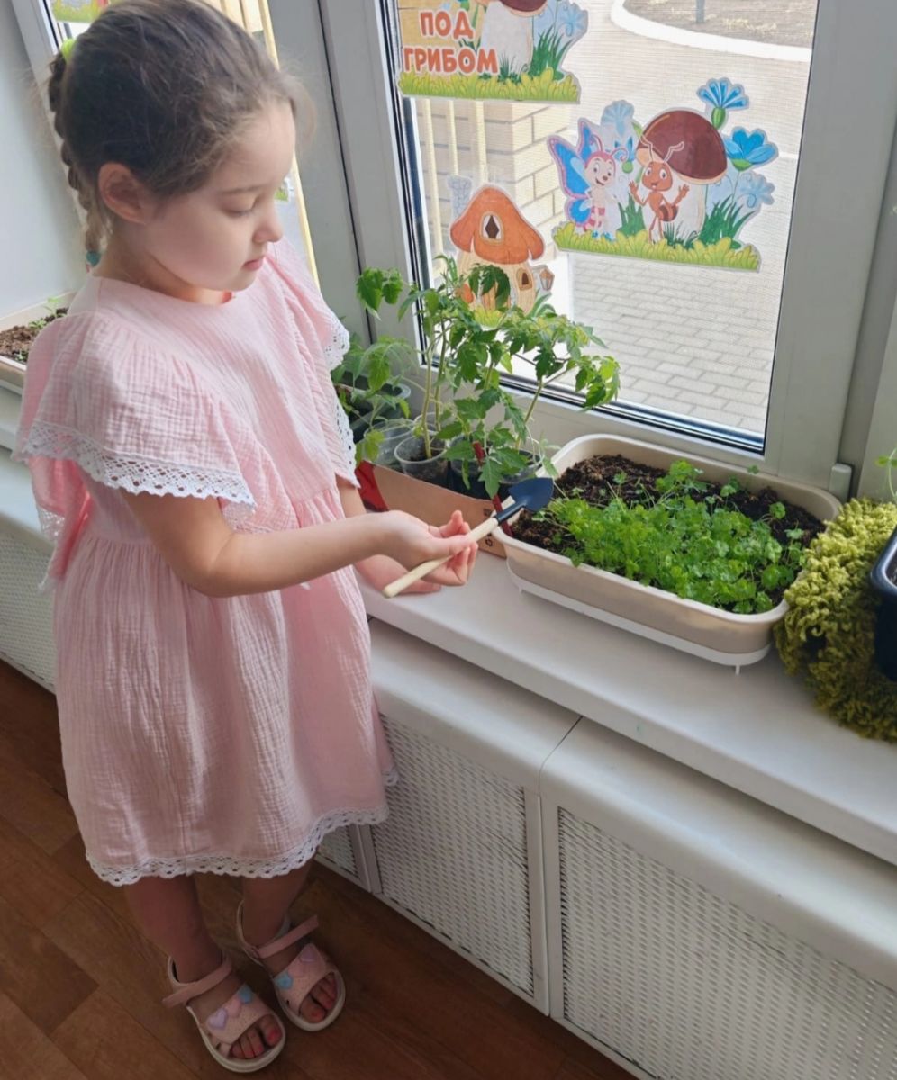 Сначала ребята высаживают на подоконнике цветы, овощные культуры, затем за ними ухаживают, поливают.