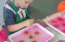 В детском саду проводится кружок "Эбру- танец красок". Дети рисуют на воде, используя древневосточную технику и переносят рисунок на бумагу