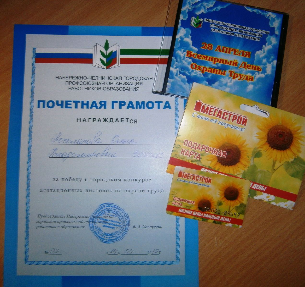 Охрана труда 26.04.2017МБОУ СОШ №30 26 апреля приняла участие в семинаре-совещании для уполномоченных по охране труда и председателей ППО,посвященному Всемирному Дню охраны труда по теме "Вместе повысим культуру профилактики в охране труда" проходящем в ДК "Энергетик"организованном Набережно-Челнинской городской профсоюзной организацией работников образования.Работа проходила в 2 этапа: работа групп по секциям (квест-игра), пленарная часть.Школа получила награду в городском конкурсе агитационных листовок по ОТ и подарочную карту "Мегастрой".ПОЗДРАВЛЯЕМ!!! 21.04.2017Поздравляем учащихся нашей школы, успешно выступивших на Республиканской с международным участием, конференции исследовательских работ учащихся «Малые Давыдовские чтения»