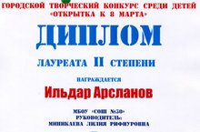 22 марта 2017 года в МАУК «ДК «КАМАЗ» состоялось награждение победителей городского творческого конкурса среди детей «Открытка к 8 Марта». Ученик нашей школы 4 А класса Арсланов Ильдар награжден дипломом 2 степени. Желаем Ильдару дальнейших успехов в его творческой деятельности!