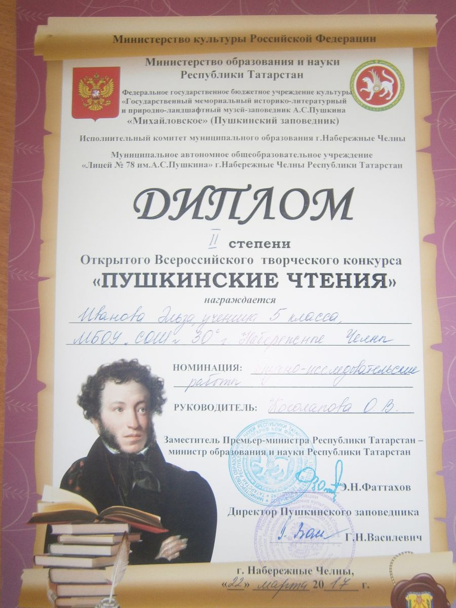 Поздравляем ДИПЛОМАНТА II Всероссийского Открытого творческого конкурса «Пушкинские чтения», ученицу 5 «А» класса Иванову Эльзу