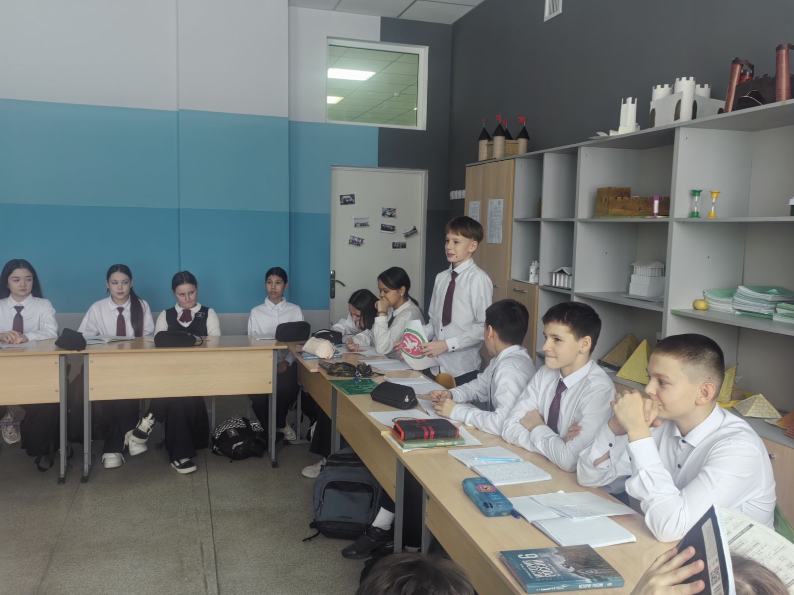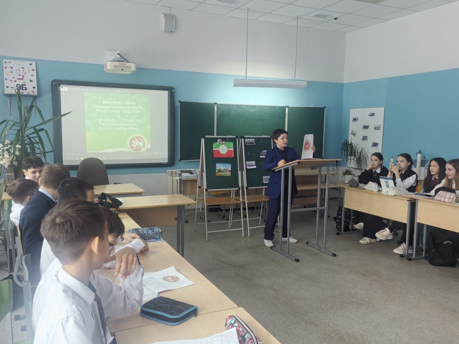 Ученики 6«А» класса на уроке истории все вместе погрузились в историю и символику одного из главных официальных символов нашей родной республики — её герба. В ходе мероприятия ученики рассказывали о том, что герб Республики Татарстан является государственным символом республики и был утверждён Постановлением Верховного Совета Республики Татарстан от 7 февраля 1992 года, о его символическом значении и о том, какую важную роль он играет в культуре и истории республики, о его олицетворении мощи и силы. Они не только слушали интересные факты, но и смотрели презентации, обсуждали, почему так важно знать и уважать государственные символы.