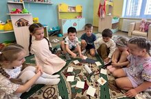 В 7 группе дети с воспитателем Айгуль Занифовной поиграли в игру «Play with bottle». Правила игры: неограниченное количество игроков садятся в круг/за стол; раскладываются карточки (в зависимости от изучаемой темы - животные, фрукты, одежда) лицевой стороной вниз. Игрок раскручивает бутылку (let’s spin the bottle), попавшую карточку переворачивает (turn it over) и отвечает на вопрос «What’s this?» (Что это?) - «This is plum/watermelon etc».
