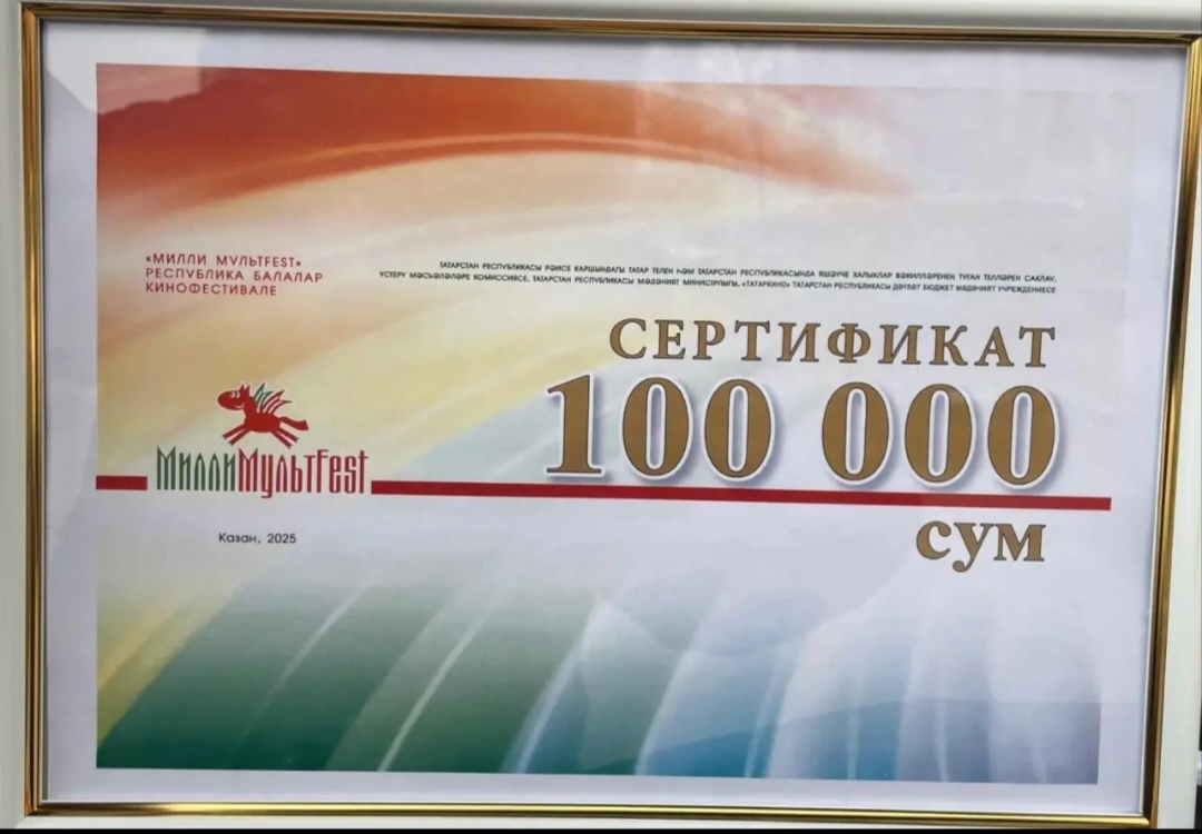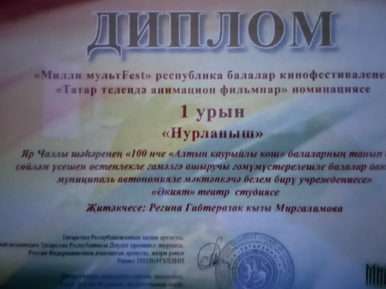 В субботу, 6 декабря, в кинотеатре «Мир» г. Казани состоялась торжественная церемония награждения победителей V Республиканского детского кинофестиваля «Милли мультFest».В номинации "Анимационные фильмы на татарском языке" наш детский сад "Жар-птица" получил заслуженное I МЕСТО! Творческим коллективом был представлен анимационный фильм "Нурланыш". Руководитель и автор - воспитатель по обучению детей родному языку Миргалимова Регина Габтеразаковна!Победители получили памятный диплом и денежный сертификат в размере 100 000 рублей!ПОЗДРАВЛЯЕМ!!! Желаем дальнейших творческих успехов!Кинофестиваль нацелен на развитие детского кинематографического творчества и сохранение культурного наследия татарского народа. Его основная цель – сохранение татарского языка, развитие зрительской культуры и содействие обогащению духовной, интеллектуальной и творческой сферы детей и подростков при помощи производства анимационных и короткометражных игровых фильмов. -