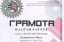 Подведены итоги городской научно-технической выставки «Рационализатор 2018». Организаторы выставки МАУ ДО ЦДТТ № 5 при поддержке ООО «Автотехник», ОАО «КАМАЗ», Управления образования и по делам молодежи города Набережные Челны. Почетной грамотой за 2 место в номинации «Детские игрушки (электрифицированные модели)» награжден обучающийся творческого объединения «Мир, техника, дети», Туктамышев Павел, руководитель Серова Т.И.