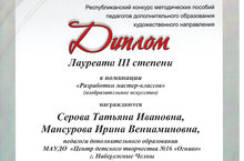 Дипломом Лауреата IIIстепени Республиканского конкурса методических пособий пдо художественной направленности, в номинации «Разработка мастер – классов» награждены педагоги Центра, Серова Т. И. и Мансурова И. В. Организаторы: ГБУ ДПО «Институт дополнительного профессионального образования специалистов социокультурной сферы и искусства» и МАУДО ДШИ № 13. Конкурс проведен с целью выявления лучших методических пособий пдо, содействующих повышению качества образовательного процесса.