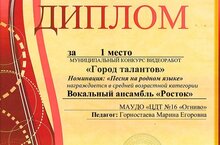 Исламова Зарина и Исламова Аделина - обучающиеся вокального ансамбля «Росток» стали лауреатами 1 степени в номинации: «Пою, тебе, моя Россия» Международного конкурса «Твори! Участвуй! Побеждай!». Дипломом за подготовку лауреатов отмечена и руководитель Горностаева Марина Егоровна. В конкурсе приняли участие более десяти тысяч исполнителей из числа детей, молодежи и взрослых.