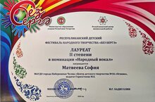 Солистка вокального ансамбля «Росток» (руководитель Горностаева М. Е.), 5 ноября выступила на гала-концерте Республиканского детского фестиваля народного творчества «Без бергә» в номинации «Народный вокал» (соло), в городе Казань.