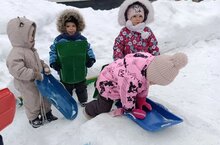 Катание на санках — любимое занятие: мальчишки и девчонки мчатся с горы, соревнуясь и громко смеясь. Другие играют в игры на снеговых насыпях и ярких дорожках.