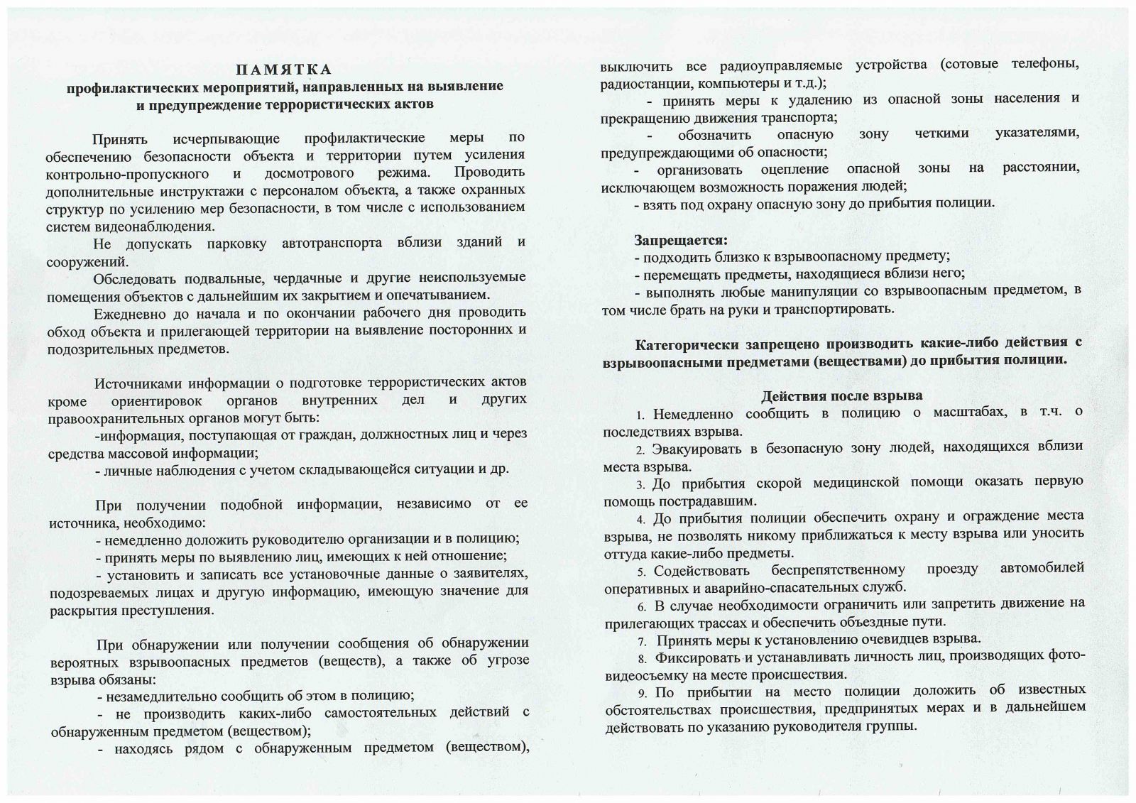 Памятка профилактических мероприятий, направленных на выявление и предупреждение террористических актов 13.04.2017
