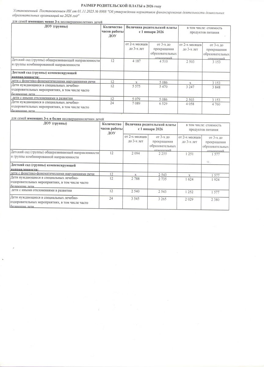 Согласно постановлению от 01.11.2025 №8988 «Об утверждении нормативов финансирования деятельности дошкольных образовательных организаций г.Набережные Челны на 2026 год» с 01.01.2026 года меняется размер родительской платы.