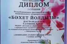 Поздравляем Султанову Адилю, занявшую 1 место и Мустафину Зарину, занявшую 3 место в республиканском фестивале – конкурсе национального татарского искусства «Бәхет йолдызы»