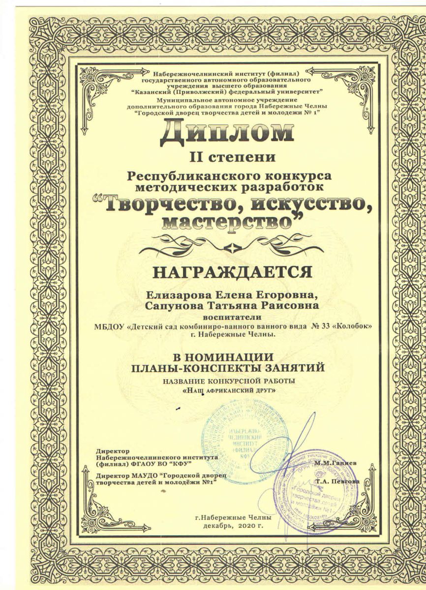 Республиканский конкурс  методических разработок "Творчество, искусство и мастерство" Елизарова Е.Е. Диплом 2 степени