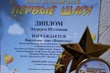 Наши воспитанницы, занимающиеся в вокальном кружке "Непоседы" с музыкальным руководителем Белянцевой Еленой Николаевной приняли участие в Республиканском конкурсе юных исполнителей "Первые шаги." Среди более тысячи участников мы заняли третье место в номинации "Вокал трио" с песенно-танцевальным номером "Смайлики". Поздравляем и желаем дальнейших побед!