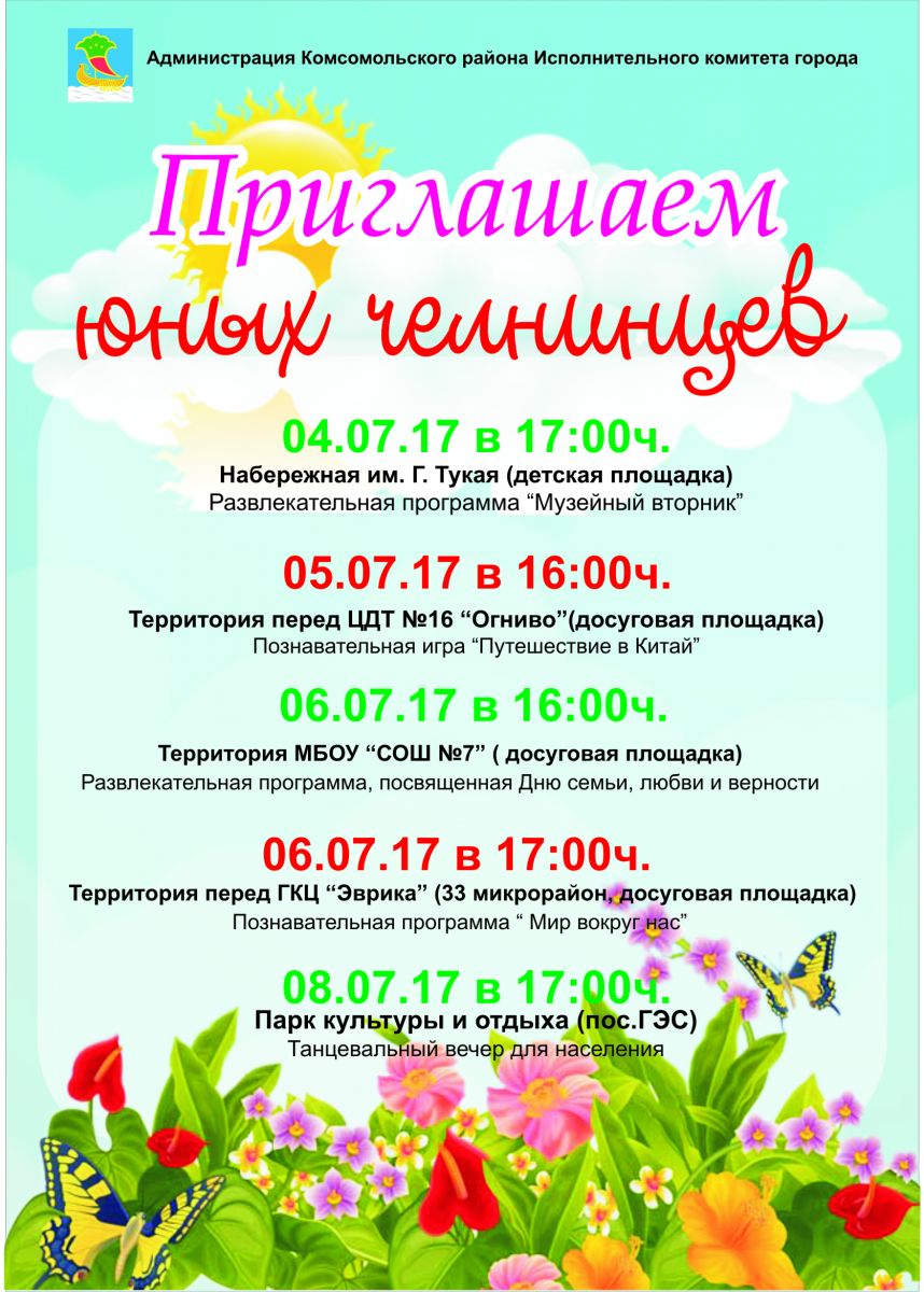 Уважаемые родители!!! Администрация Комсомольского района Исполнительного комитета города Набережные Челны приглашает юных челнинцев на развлекательно - познавательные мероприятия!!!
