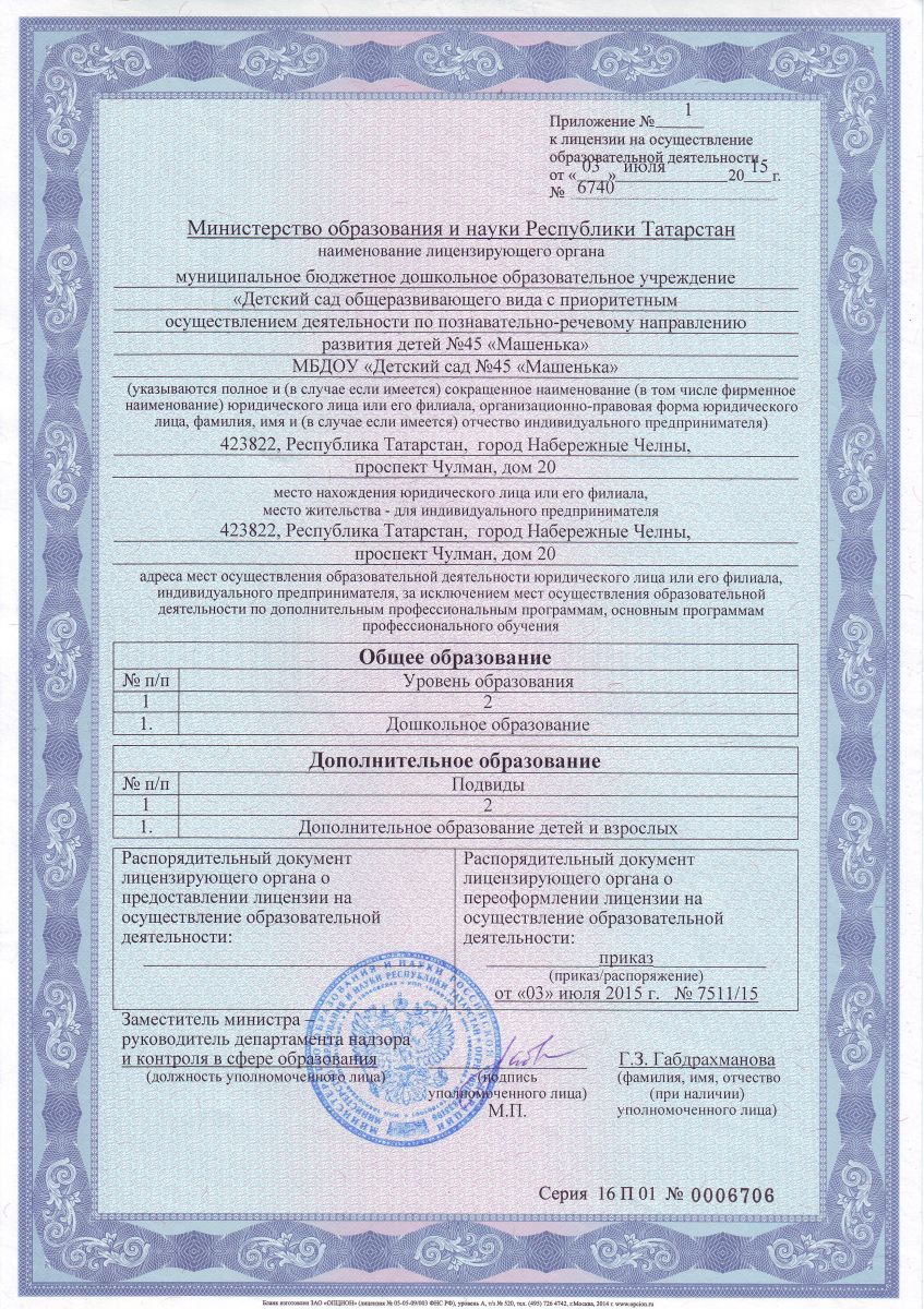 Лицензия на образовательную деятельность, приложение к лицензии №1