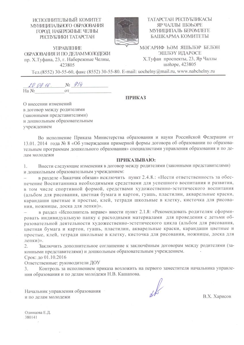 Опубликовано: 02.10.2016«В соответствии с Приказом Министерства образования и науки Российской Федерации от 13.01. 2014 года № 8 «Об утверждении примерной формы договора об образовании по образовательным программам дошкольного образования» внесены изменения в форму договора между родителями (законными представителями) и дошкольным образовательным учреждением. Изменения утверждены приказом управления образования и по делам молодежи № 914 от 20.09.2016 г.»