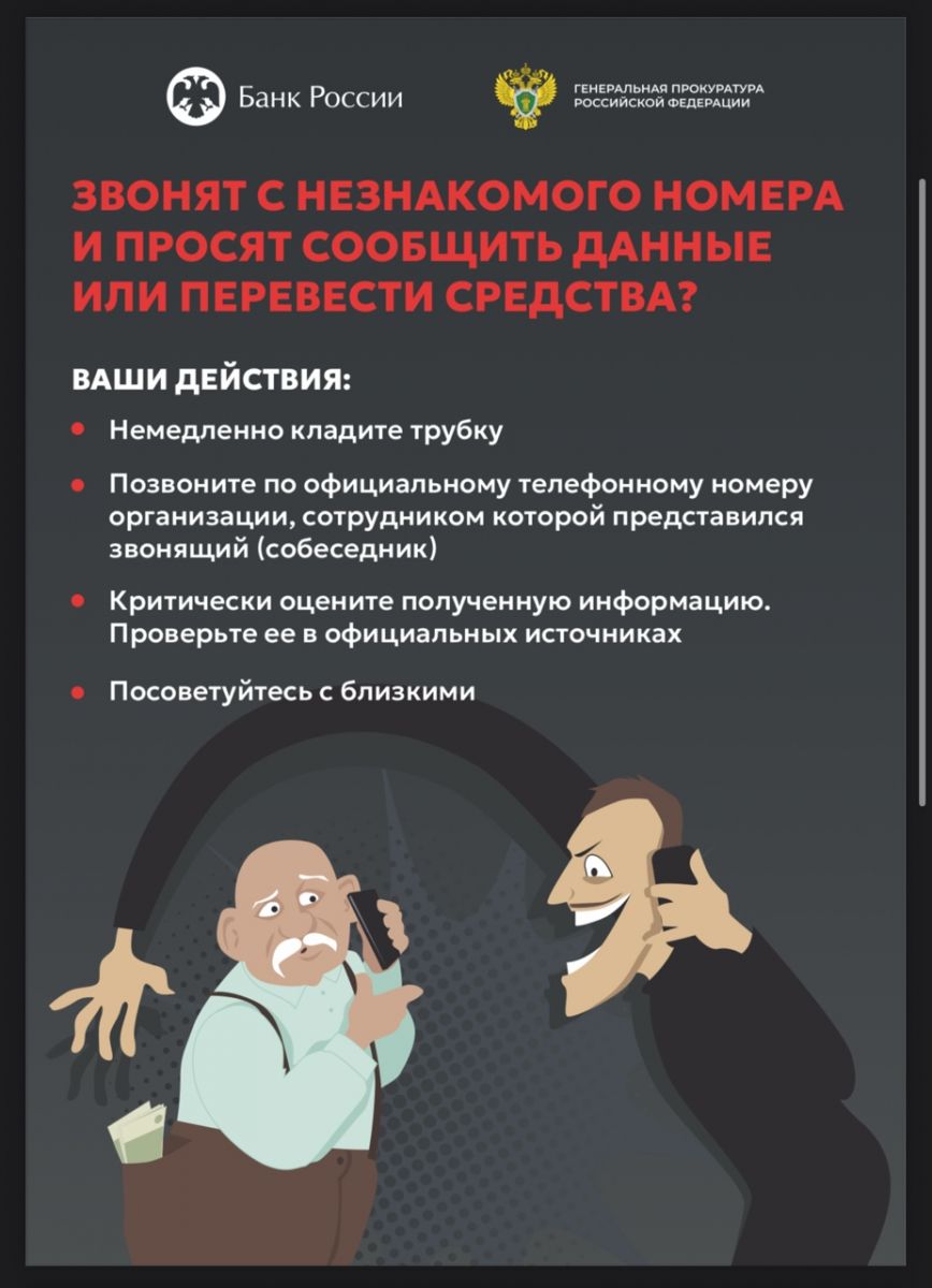 Опубликовано: 04.08.2025Уважаемые родители!!! Министерство образования и науки РТ просит Вас быть предельно внимательными в отношении различных телефонных звонков и направляет памятку как действовать в данной ситуации с целью повышения уровня информированности населения о действиях лиц, вводящих в заблуждение с целью хищения денежных средств. Пожалуйста будьте бдительны!!! Дополнительные материалы по профилактике преступлений доступны по ссылке: https://disk.yandex.ru/d/LZo5bZvq65815A