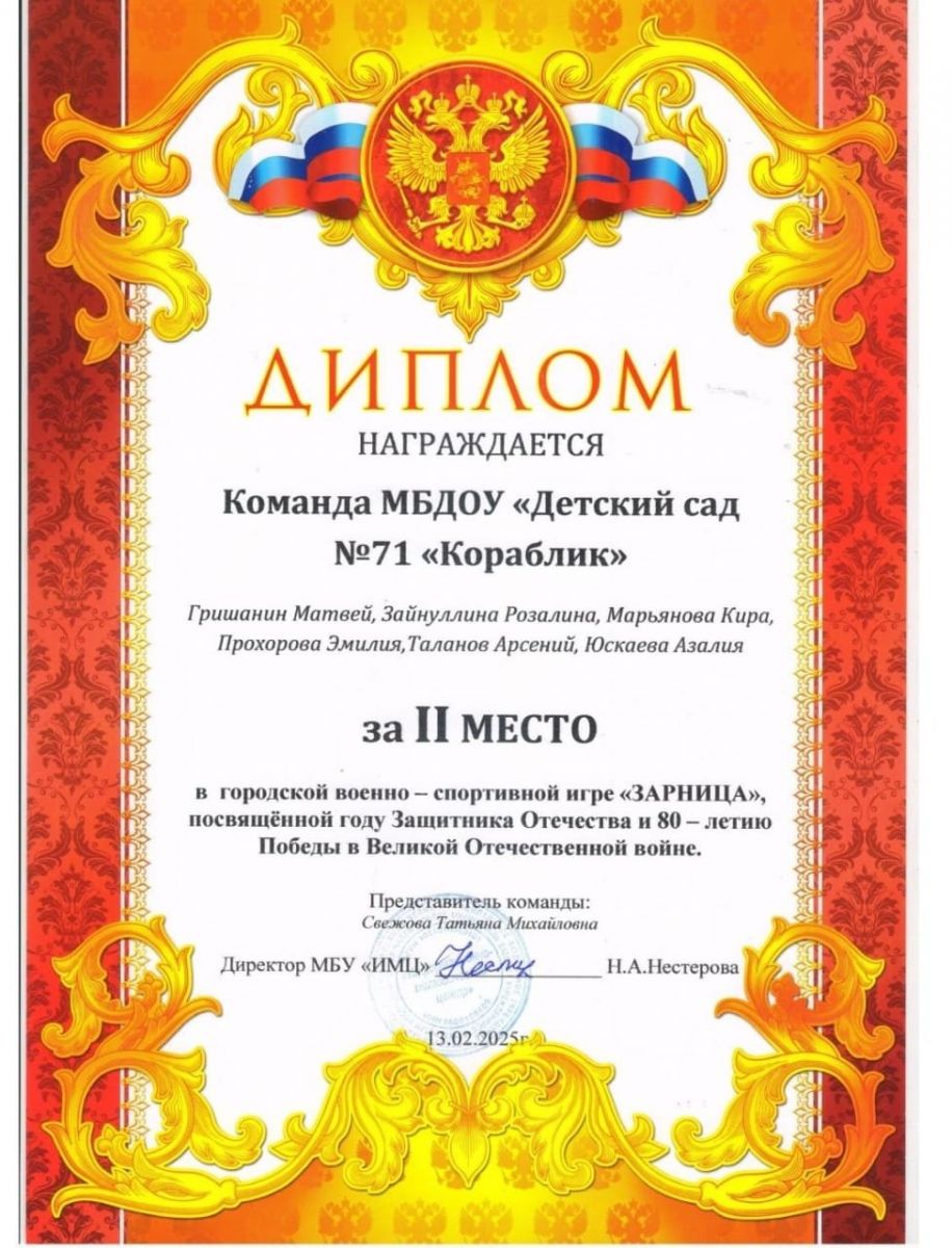 Наши спортивные достижения февраля! Успешные выступления лыжниц ДОУ 71 "Кораблик" и воспитанников в игре "Зарница" мы посвятили 80 летию Победы в Великой Отечественной войне!