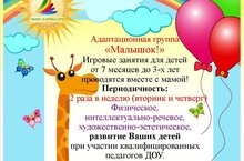 Приглашаем малышей с их мамочками на занятия в адаптационную группу "Малышок"! Здесь вас встретят квалифицированные специалисты, которые предложат занятия для физического, интеллектуально-речевого, художественно-эстетического развития вашего ребенка. Периодичность занятий: 2 раза в неделю (вторник и четверг). Абонемент: 4 занятия в неделю - 400 руб, 16 занятий в месяц - 1600 руб. Первое занятие бесплатное.