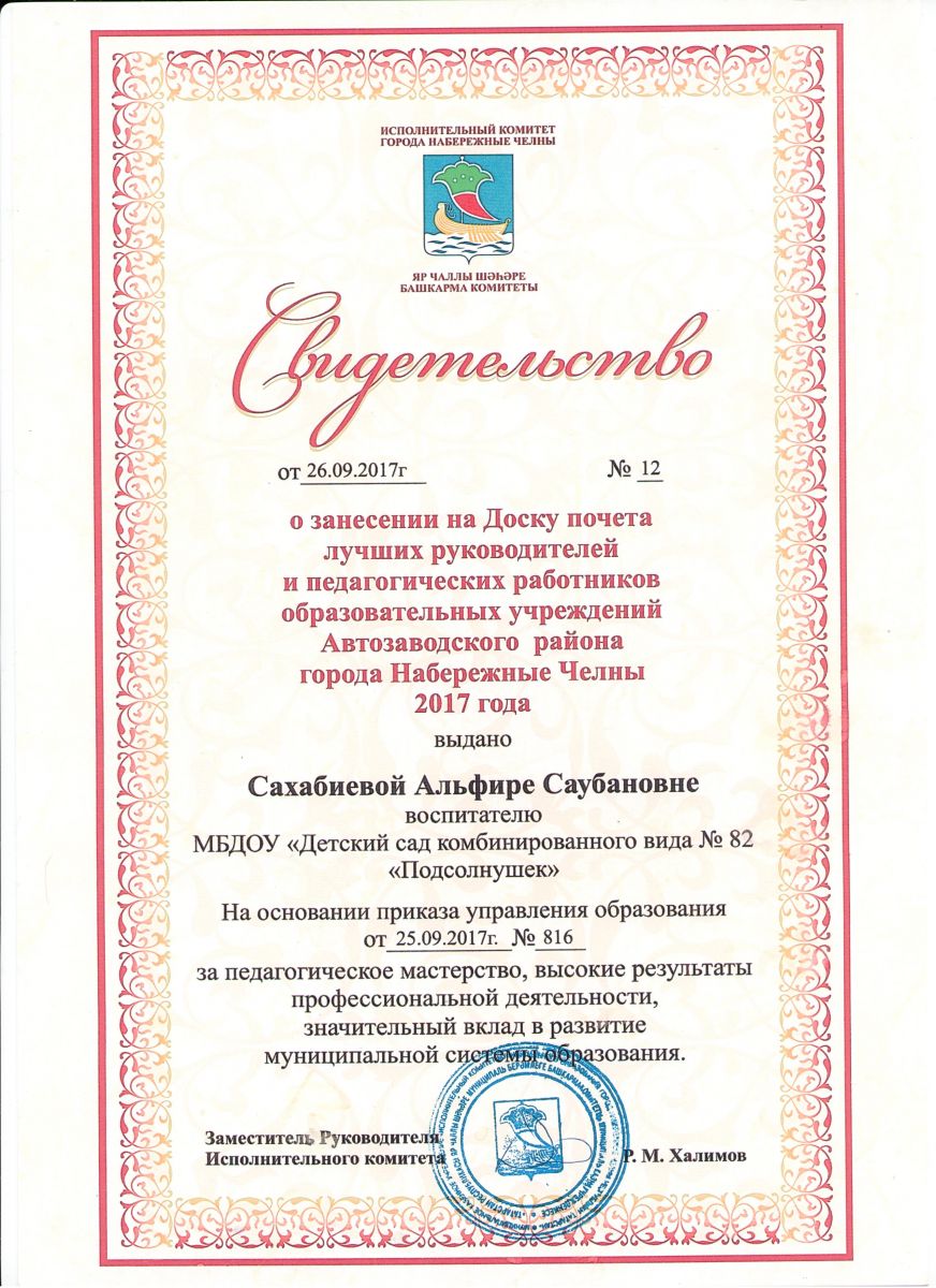 Наш коллектив поздравляет воспитателя Сахабиеву А.С. с занесением на Доску почета лучших руководителей и педагогических работников образовательных учреждений Автозаводского района г.Набережные Челны. Свидетельство № 12 от 26.09.2017