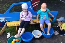Два тазика: в одном – теплая вода с плавающими мячиками, в другом – пустой. Ребята садились на стульчики и с радостью перебирали шарики ножками из одного тазика в другой!
