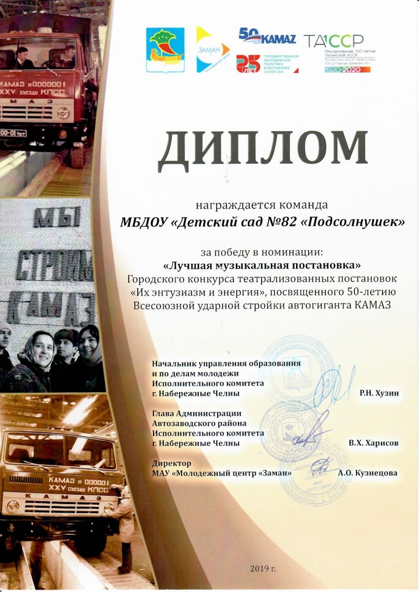 Театральная труппа детского сада №82 стали победителями в номинации "Лучшая музыкальная постановка" в городском конкурсе "Их энтузиазм и энергия", который посвящен 50 летию Камаза.