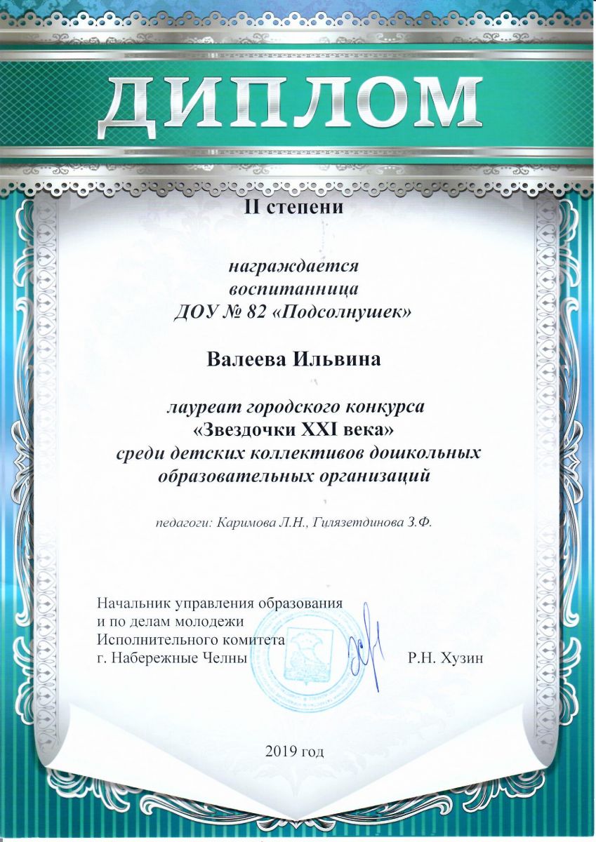 Вокальный ансамбль "Сандугачлар" детского сада №82 "Подсолнушек" стали победителями городского конкурса "Звездочки 21 века" и были награждены дипломом II степени.