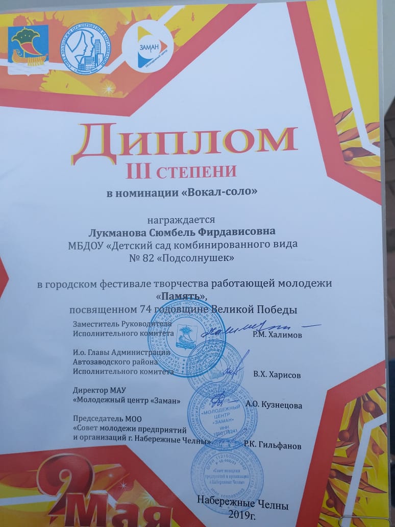Воспитатель ДОУ №82 Лукманова Сюмбель Фирдависовна приняла участие в городском фестивале творчества работающей молодежи "Память" и стала победителм III степени в номинации "Вокал-соло". Также приняла участие на городском концерте ко Дню Победы, который прошел в парке Победы г. Набережные Челны.