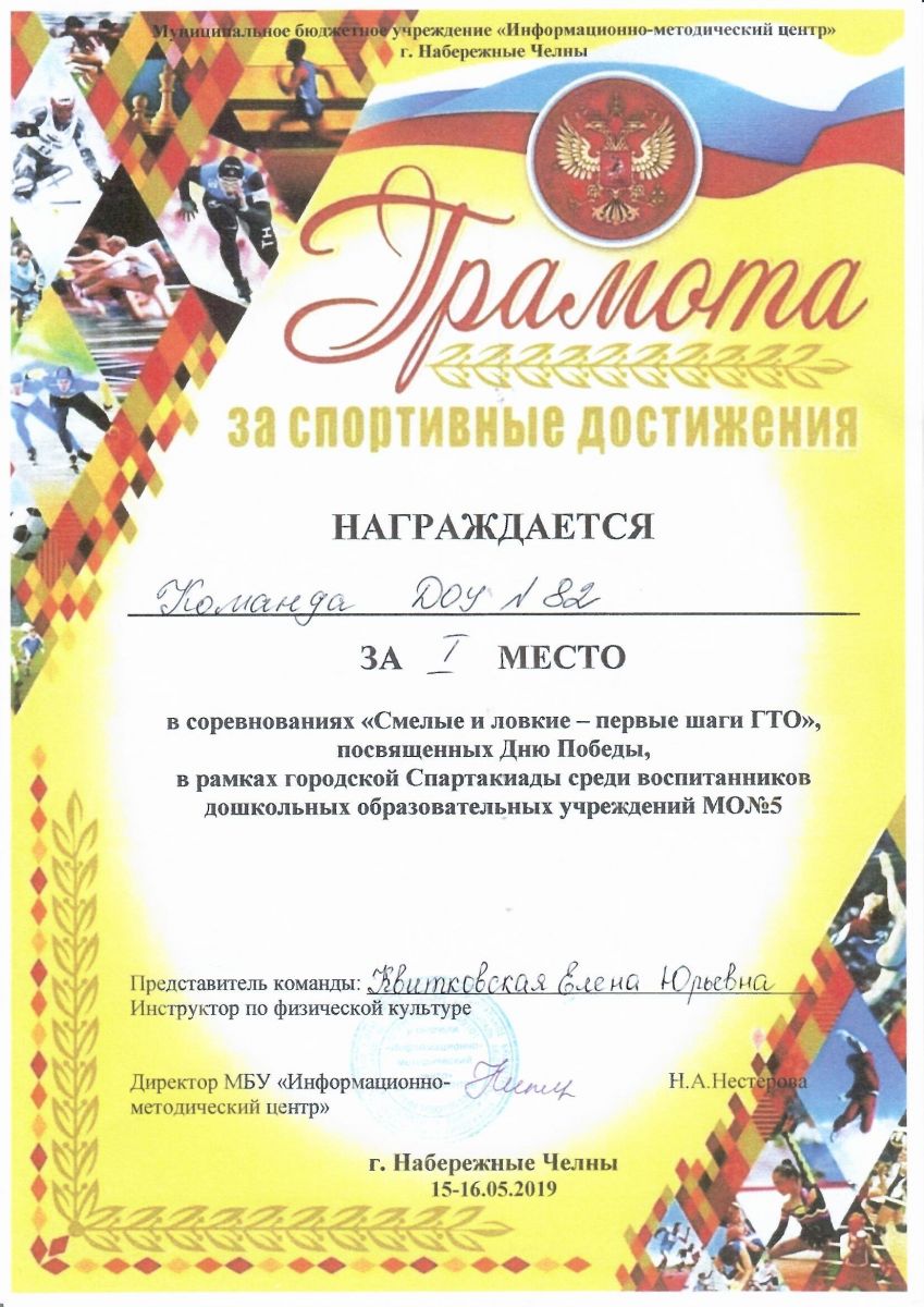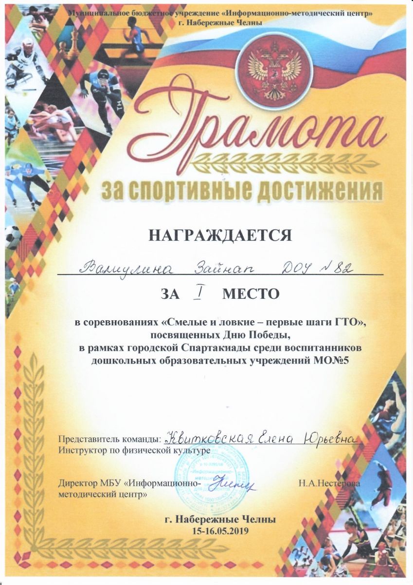 Сегодня на базе ДОУ №66 состоялись соревнования "Смелые и ловкие - первые шаги ГТО", посвященные Дню Победы, в рамках городской Спартакиады среди воспитанников ДОУ МО №5. Команда нашего детского сада под руководством инструктора по физической культуре Каитковской Елены Юрьевны заняла I место в общекомандном зачете, Валиуллина Зайнап заняла I место среди девочек. Поздравляем их с победой!