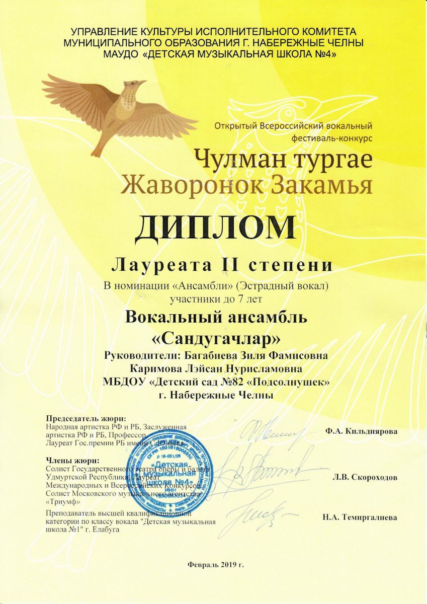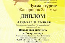 Балалар бакчасының "Сандугачлар" вокал ансамбле "Чулман тургае" җыр бәйгесендә икенче дәрәҗә лауреат исеменә лаек булдылар. Котлыйбыз аларны!