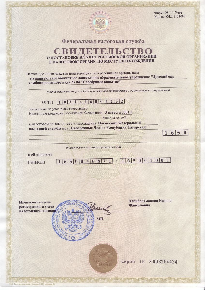 Свидетельство о постановке на учет Российской Организации в Налоговом органе по месту ее нахождения.